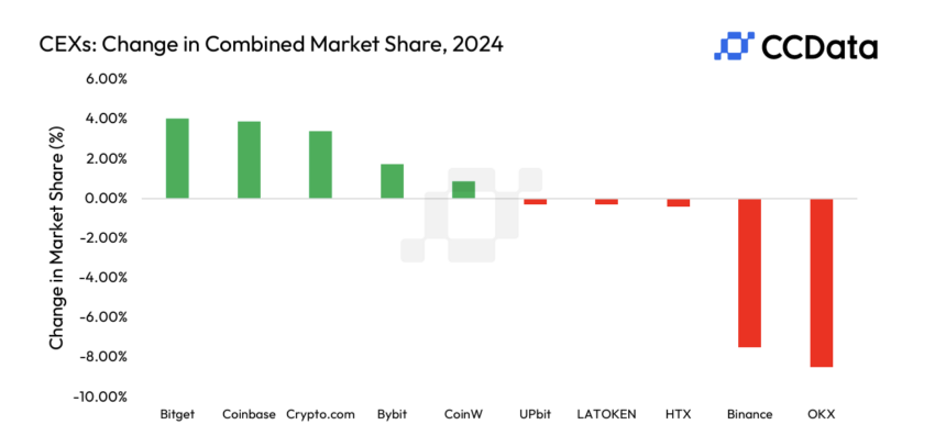 Además, la participación de mercado combinada de los CEX Bitget, Coinbase y Crypto.com, creció 4,05%, 3,89% y 3,89% hasta el 10,5%, 5,43% y 4,71%, respectivamente. En tanto, OKX Binance, HTX, perdieron la participación de mercado en 2024, cayendo 8,46%, 7,49% y 0,37% hasta el 12,4%, 35,1% y 0,98% respectivamente.