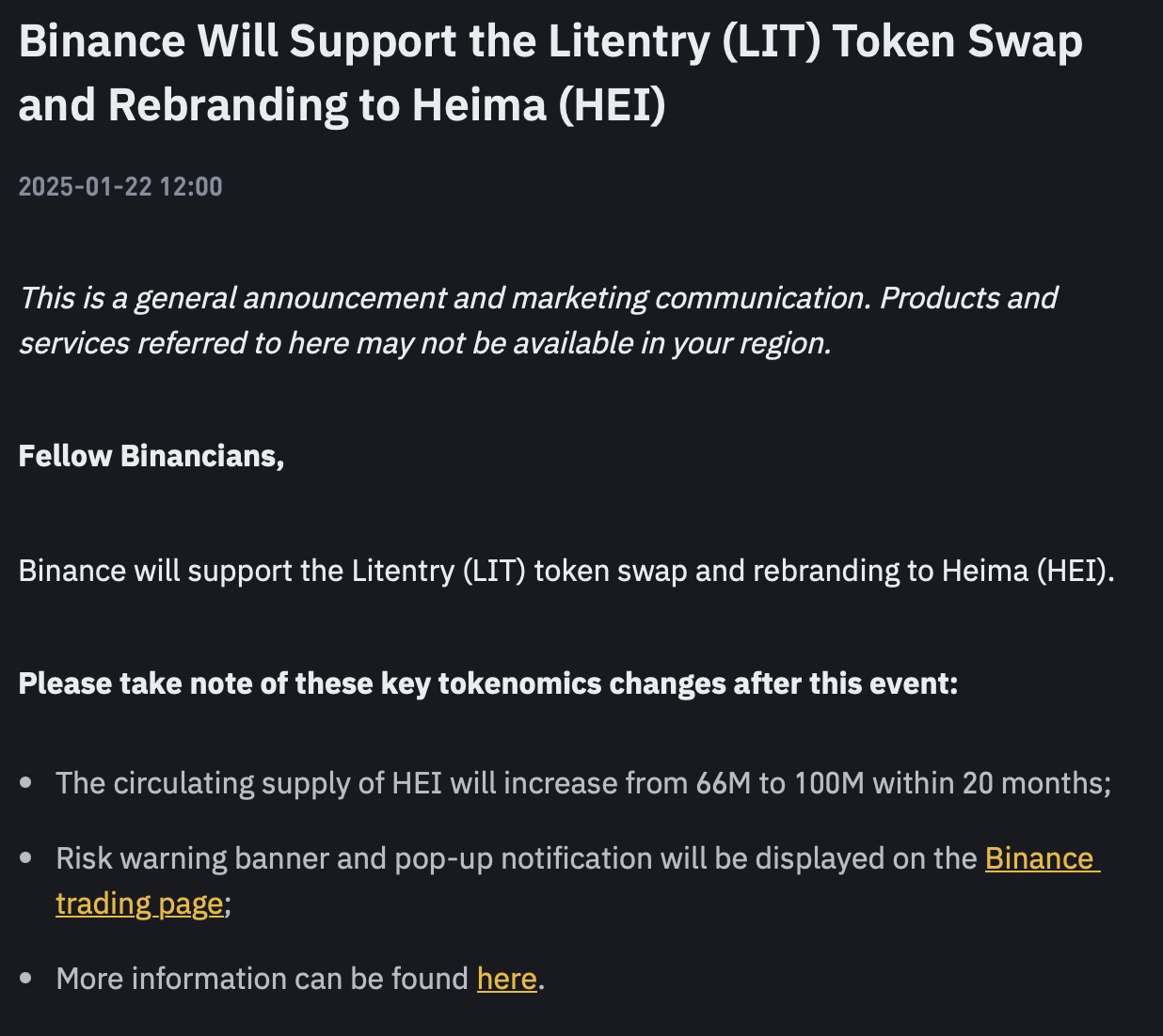 El intercambio de criptomonedas Binance ha anunciado su apoyo al cambio de marca de Litentry (LIT) a Heima (HEI) y el intercambio de monedas asociado. Esta transición implicará cambios significativos para los usuarios, incluyendo un aumento en la oferta circulante de monedas HEI de 66 millones a 100 millones en los próximos 20 meses.