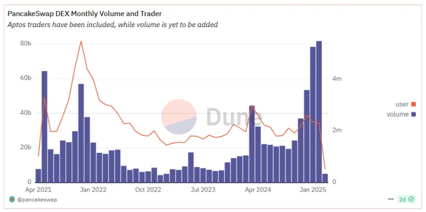 PancakeSwap, un exchange descentralizado (DEX) líder que opera en nueve redes blockchain, estableció un nuevo récord de actividad de trading en enero y febrero de 2025. Ha alcanzado el volumen mensual de trading más alto desde 2021.