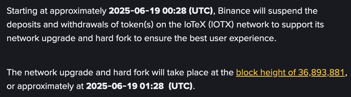 - Binance confirma apoyo a IoTeX durante actualización y hard fork del 19 de junio.