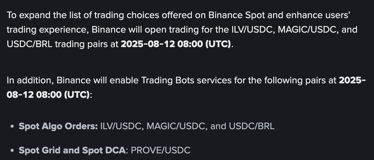El principal intercambio global de criptomonedas Binance está listo para mejorar las opciones de comercio para sus usuarios al revelar nuevos pares de comercio. El 12 de hacesto de 2025, a las 11:00 AM, hora estándar de Turquía (TSI), Binance Spot presentará nuevas combinaciones para mejorar la experiencia del usuario y ampliar las opciones de comercio. Los nuevos pares ILV/USDC, MAGIC/USDC y USDC/BRL estarán disponibles, junto con la activación de los servicios de Bots Comerciales, abarcando además estos pares en Órdenes Spot Algo. Mientras tanto, los servicios Spot Grid y Spot DCA se lanzarán con el par PROVE/USDC.