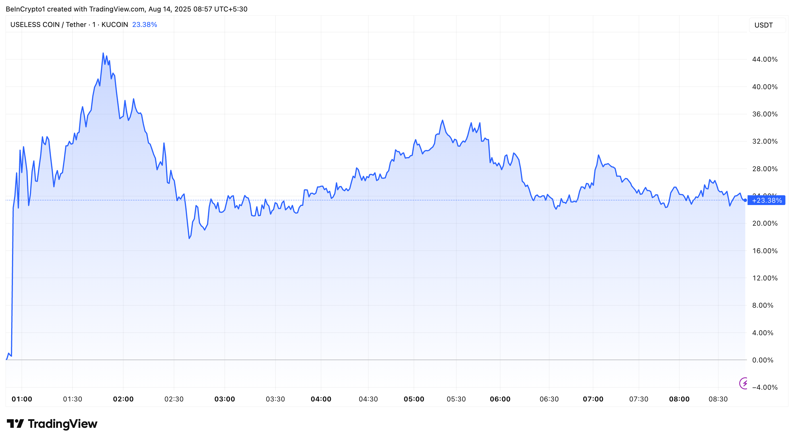 Tras este pico, la moneda experimentó una ligera corrección. Sin embargo, los desarrollos recientes reavivaron su momentum alcista. El 13 de agosto, Kraken anunció el listado de USELESS.