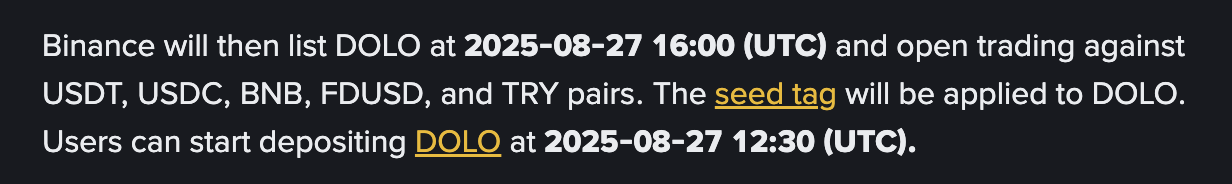 La moneda DOLO estará disponible para cotizar en pares con USDT, USDC, BNB, FDUSD y TRY. Los depósitos a Binance para DOLO comenzarán a las 15:30 hora local. Este altcoin llevará una etiqueta “Seed Tag”.