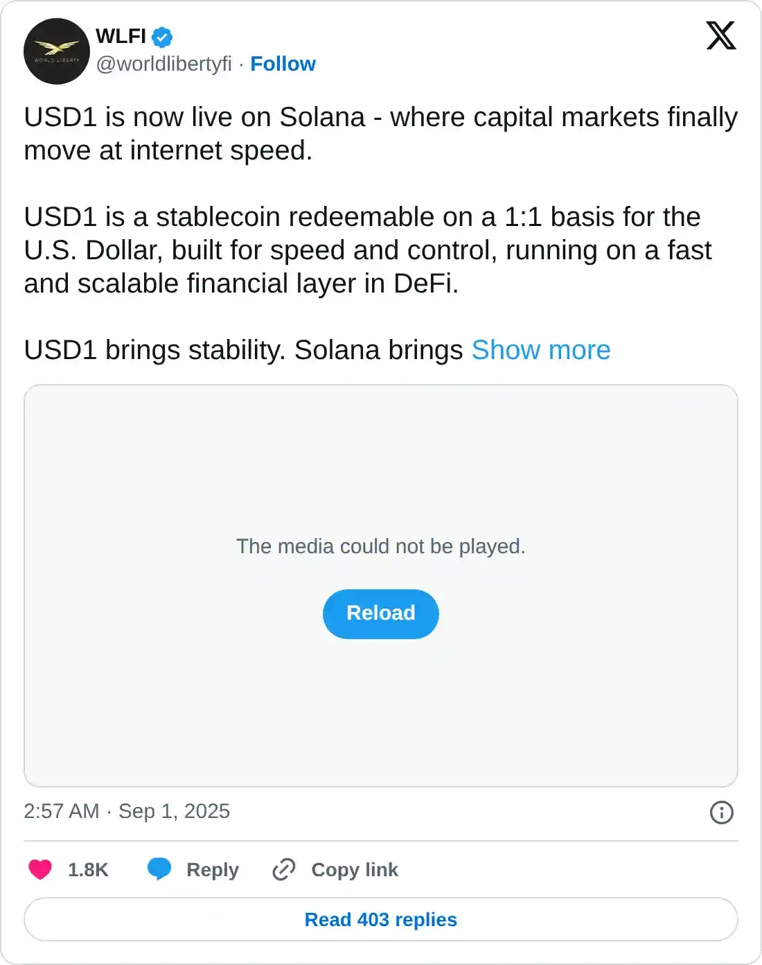 Aparte de esto, WLFI anunció el lunes que su stablecoin recientemente lanzada USD1, que está respaldada 1:1 con el Dólar estadounidense, está activa en la blockchain de Solana, señalando un mayor crecimiento y adopción en su ecosistema.