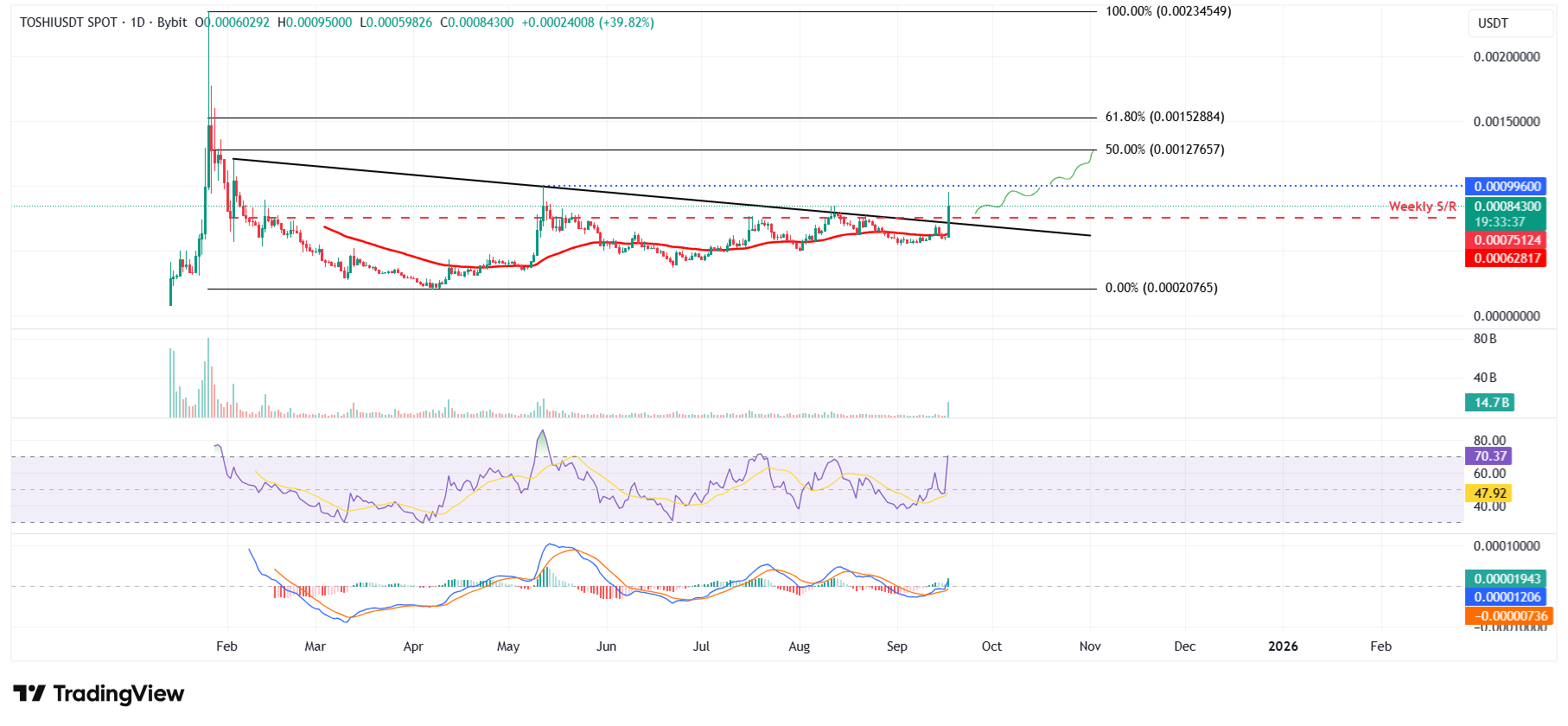 Si TOSHI continúa su impulso ascendente, podría extender las ganancias hacia su máximo del 12 de mayo de 0.000996$.