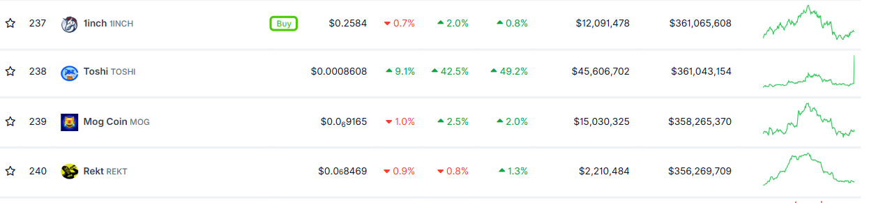 Los datos de CoinGecko muestran que la capitalización de mercado de Toshi alcanzó los 361.04 millones de dólares el miércoles, superando a otras populares monedas meme, como Mog Coin (MOG) y Rekt (REKT), mientras apunta a superar a 1inch (INCH) al asegurar el puesto 238 en la tabla de capitalización de mercado de criptomonedas en general.