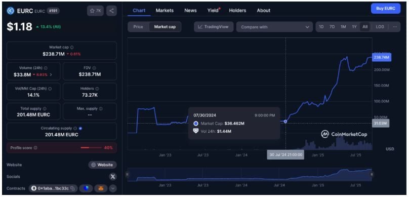 Mientras tanto, EURC sigue siendo un activo pequeño con una capitalización de 238,71 millones de dólares y un volumen de 33.8 millones de dólares en las últimas 24 horas. Sin embargo, la stablecoin basada en euros muestra un crecimiento constante de más de 200 millones de dólares, desde una capitalización de mercado de 36.46 dólares hace 14 meses, el 30 de julio.