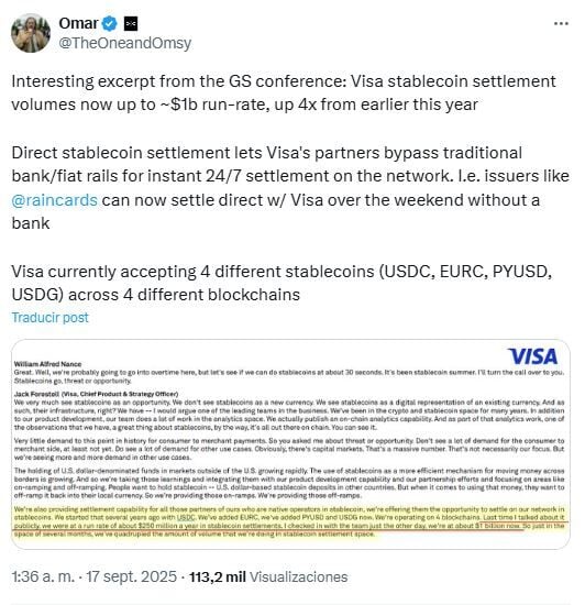 Además, USDC y EURC son dos de las cuatro stablecoins aceptadas por Visa en cuatro blockchains. Un extracto de la conferencia GS compartido por el inversor de DragonFly, Omar, en X, destaca un “crecimiento de cuatro veces en el volumen de liquidación de stablecoins, de 250 millones de dólares a 1.000 millones de dólares, en tan solo unos meses", según Jack Forestell, director de Producto y Estrategia de Visa.
