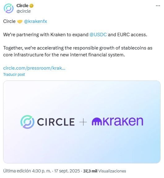 Según el anuncio publicado por Circle el 17 de septiembre, los clientes de Kraken obtendrán acceso a mayor liquidez, comisiones de conversión reducidas y nuevas oportunidades para implementar USDC en las aplicaciones de Kraken. Además, la plataforma de intercambio de criptomonedas incorporará el acceso a EURC, algo que aún no estaba disponible.