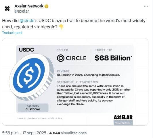 Según una publicación reciente de Axelar Network, USDC es la stablecoin regulada más utilizada del mundo, con una capitalización de mercado actual de 68.000 millones de dólares. El producto de Circle, vinculado al dólar, ha experimentado un crecimiento sostenido desde que Donald Trump fue elegido presidente de Estados Unidos, mientras que la capitalización de mercado total de las stablecoins ha crecido un 54% desde la elección de Trump en 2024.