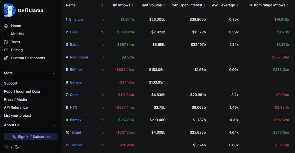 Durante el tercer trimestre de 2025, el exchange registró entradas netas por 14.800 millones de dólares, según datos de DeFiLlama. En contraste, los diez mayores exchanges centralizados siguientes atrajeron en conjunto apenas 94 millones. La cifra no solo refuerza el dominio de Binance: redefine la escala de concentración de liquidez en el sector.