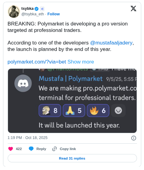 El 18 de octubre, un trader de Polymarket conocido como Tsybka compartió un mensaje de Discord del desarrollador Mustafa Aljadery. En el mensaje, Aljadery confirmó que la plataforma avanzada debutará antes de fin de año.