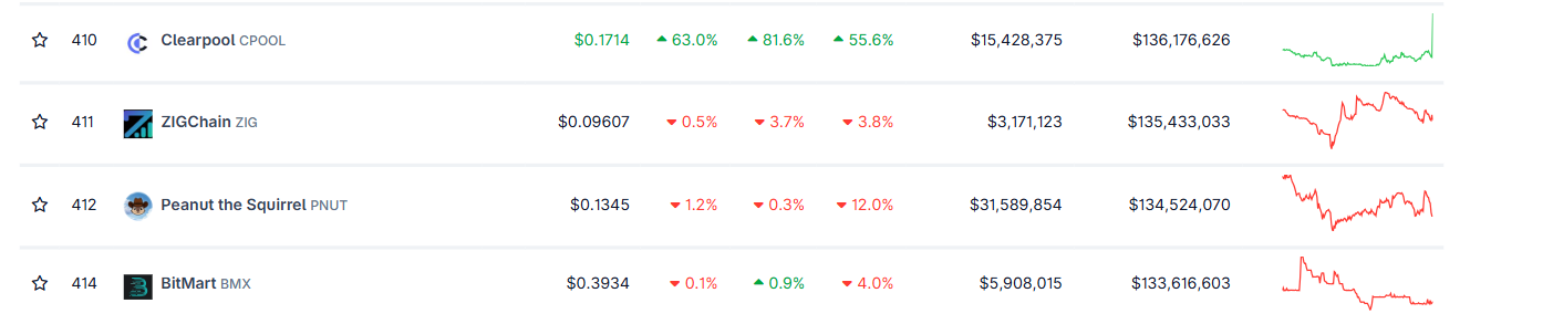 Los datos de CoinGecko muestran que la capitalización de mercado de Clearpool alcanza más de 136 millones de dólares el miércoles, superando a otras altcoins populares como ZIGChain (ZIG) y Peanut the Squirrel (PNUT), asegurando el puesto 410 en la tabla de capitalización de mercado de criptomonedas en general.
