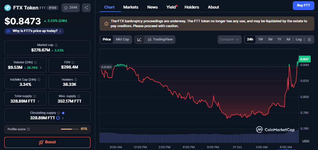 FTT ganó más del 2% en su gráfico diario para cotizar a 0,8473 dólares.