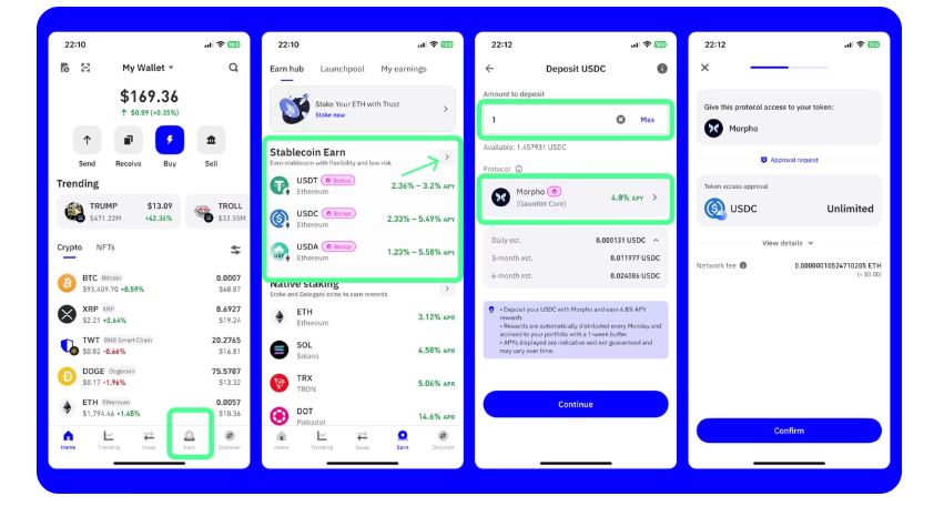 El sistema de Trust Wallet ofrece rendimientos diarios y permite retirar los activos en cualquier momento.