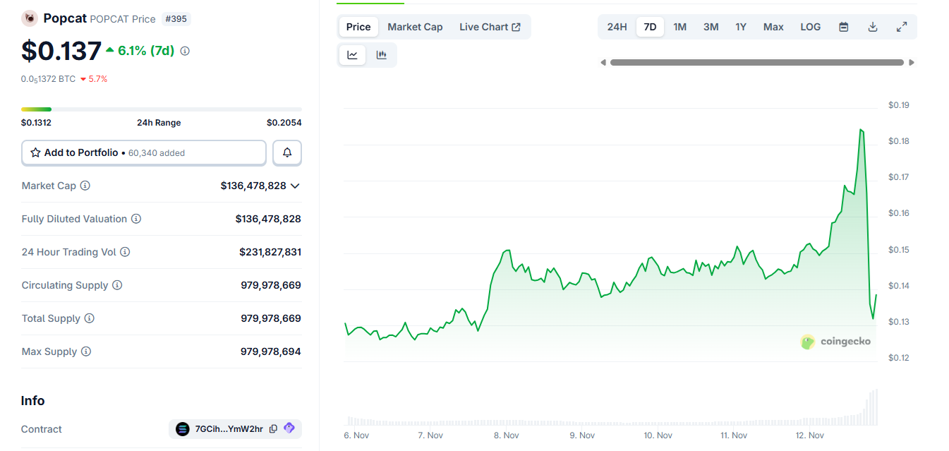 POPCAT, un token que se popularizó durante el boom inicial de los memes, experimentó una alta volatilidad en la jornada de ayer. POPCAT alcanzó brevemente los 0,20 dólares, situándose entre los tokens con mayores ganancias del día, para luego desplomarse hasta su rango habitual de 0,13 dólares.