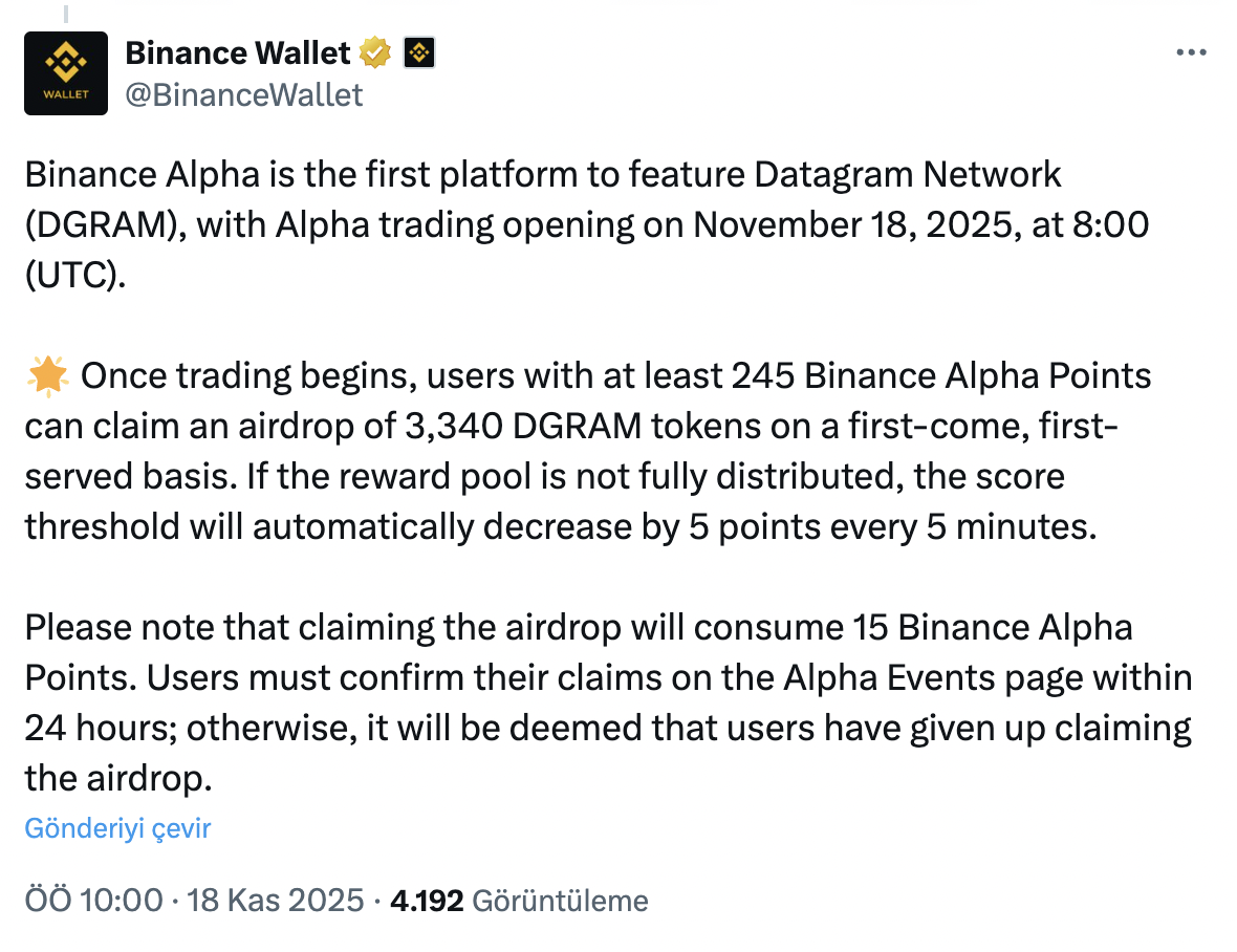 El 18 de noviembre de 2025, la división de carteras de Binance, Binance Wallet, anunció la inclusión del proyecto Datagram Network (DGRAM) en la plataforma Binance Alpha. Se espera que el comercio en Binance Alpha comience a las 11:00 AM, hora estándar de Turquía, brindando a los usuarios el beneficio adicional de participar en la campaña DGRAM AirDrop. Este anuncio significa que Binance Alpha es la primera plataforma en incluir DGRAM.