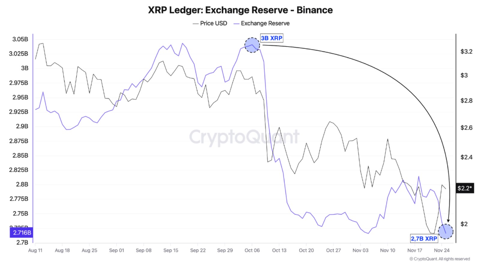 El siguiente gráfico ilustra la relación entre la cotización de XRP en dólares y la cantidad total de reservas de XRP que se mantienen en el exchange Binance, desde agosto hasta finales de noviembre.