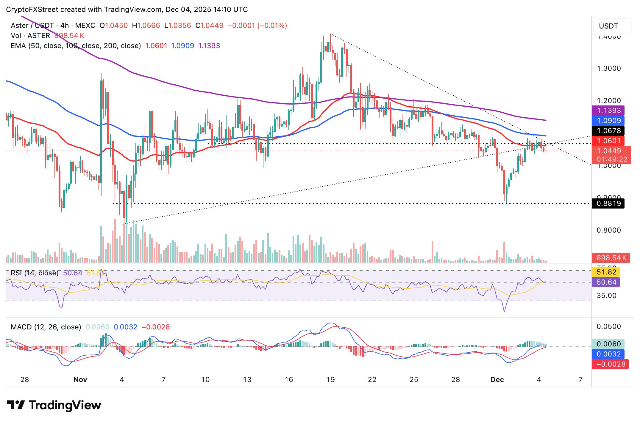 Los traders buscarán que la línea azul del MACD cruce por debajo de la línea de señal roja para validar la tesis bajista. Un descenso prolongado por debajo del nivel clave de 1.00$ podría empujar a Aster hacia el mínimo del lunes de 0.88$.