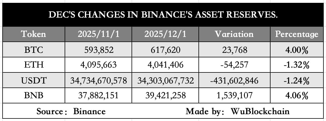 El 1 de diciembre de 2025, Binance publicó su 37º informe Proof of Reserves, revelando cambios notables en la asignación de activos de los usuarios. Según el informe revisado por Wu Blockchain, ha habido aumentos en las reservas de Bitcoin (BTC) y BNB, mientras que Ethereum (ETH) y Tether (USDT) han experimentado descensos.