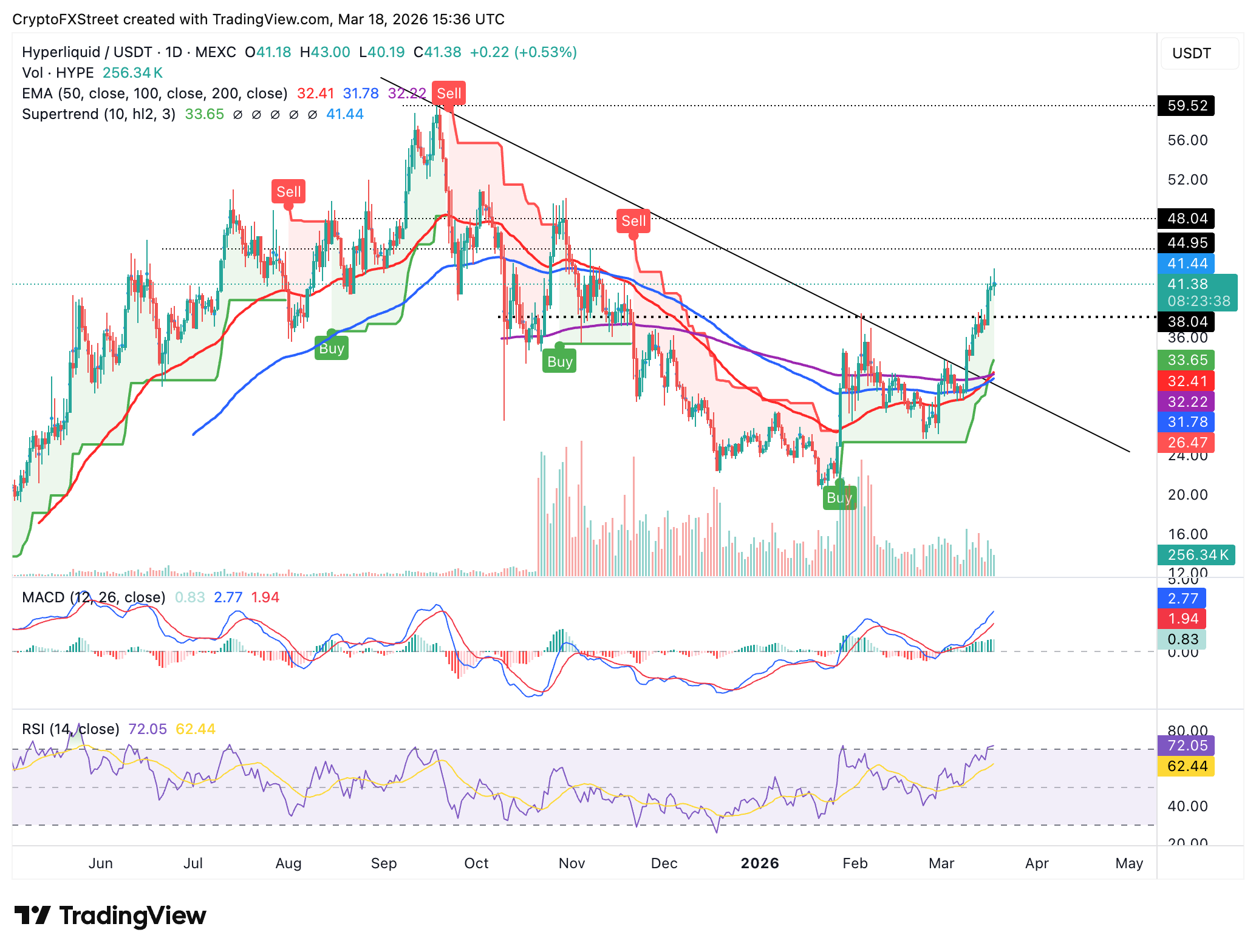 El Índice de Fuerza Relativa (RSI) en 71 en el mismo gráfico muestra condiciones de sobrecompra, pero si sube más, Hyperliquid podría extender su tendencia alcista a 45.00$. Una ruptura sostenida por encima de ese nivel expondría a $HYPE al siguiente obstáculo clave alrededor de 48.00$.
