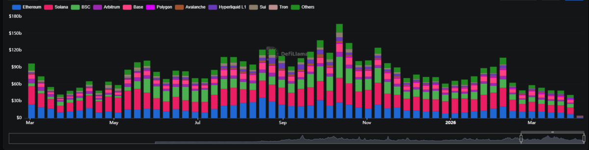 Durante la última semana, la actividad de DEX alcanzó los 41.070 millones de dólares, similar a finales de marzo de 2025, cuando registró 41.600 millones de dólares. El año pasado borró la mayor parte de las ganancias alcistas y el aumento de la actividad, aunque esta volvió a un nivel de referenciatron.