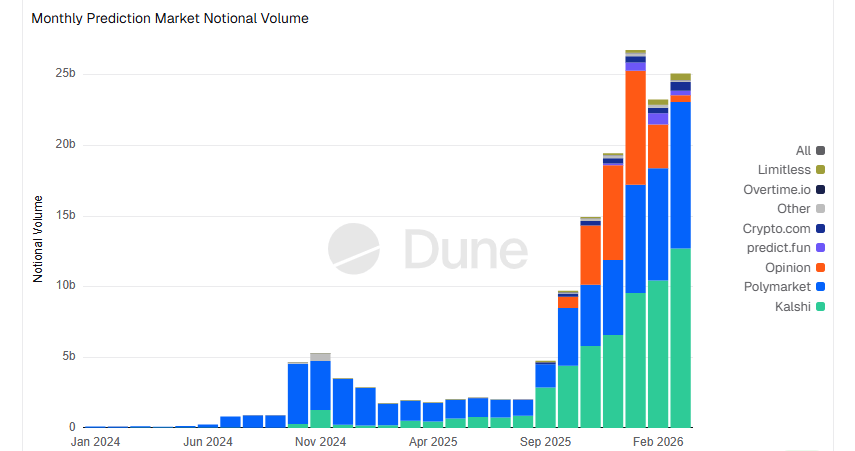 El crecimiento del sector puede verse con claridad en el gráfico de volumen mensual de mercados de predicción provisto por la firma de análisis on-chain Dune Analytics.