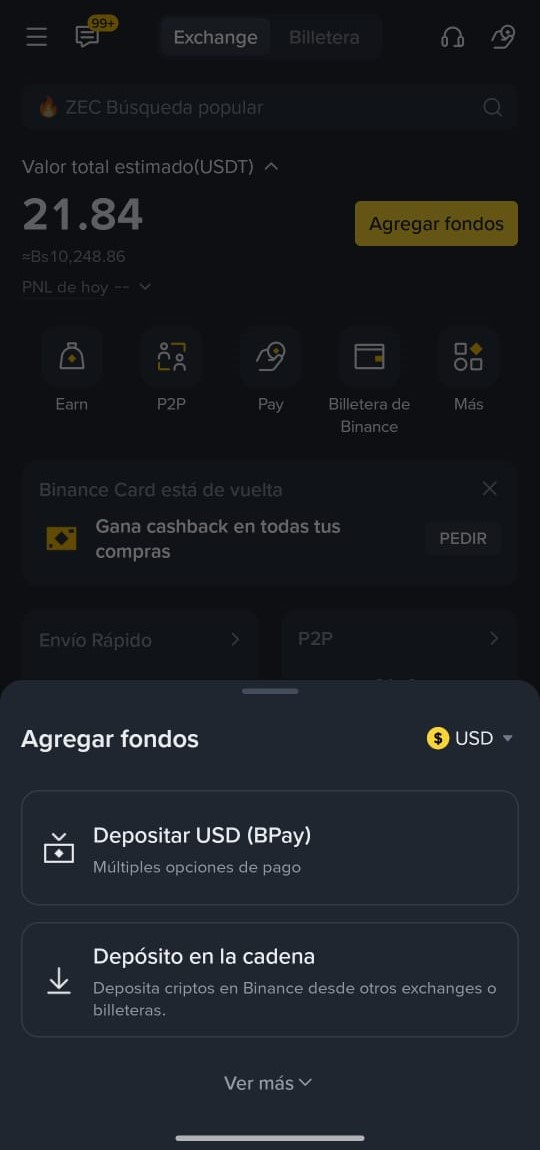 Con la tarjeta recargada y habilitada, ya es momento de ir por las criptomonedas. Pero primero hay que depositar esos dólares en la cuenta de Binance.