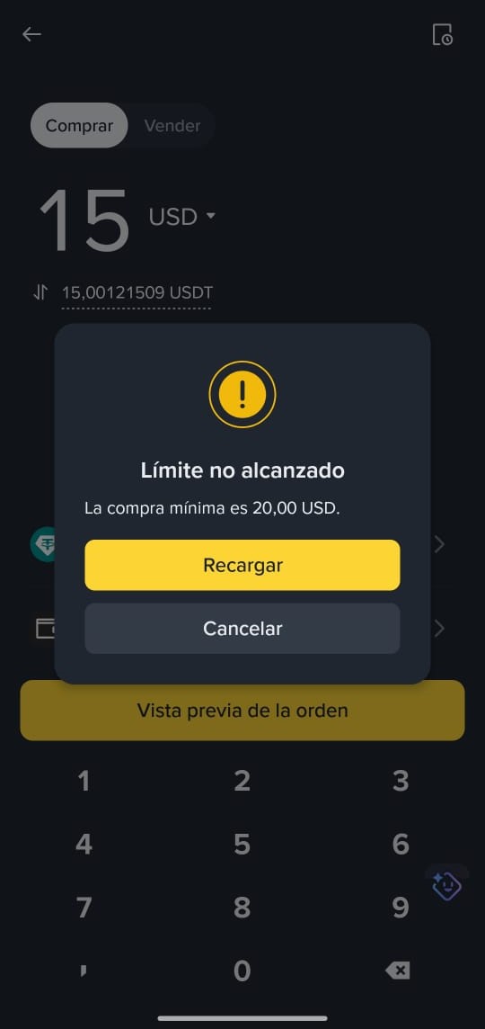 Así que, si tu objetivo es comprar $USDT con dólares depositados en Binance, recuerda que el mínimo son 20 unidades.