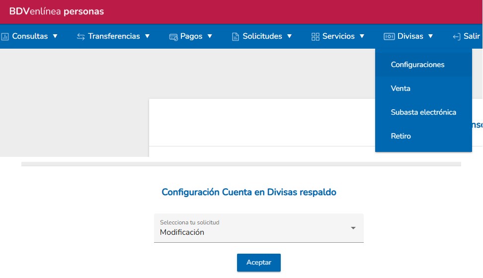 Hecho lo anterior, hay que abrir la cuenta del BDV mediante su versión para escritorio. Allí hay que ir al apartado de Divisas y luego a Configuraciones. Este paso es crucial porque permite configurar el respaldo de la cuenta de divisas. Dentro, hay que hacer clic sobre la barra y elegir la opción de Modificación. Y posteriormente, cumplir con los requisitos de seguridad.