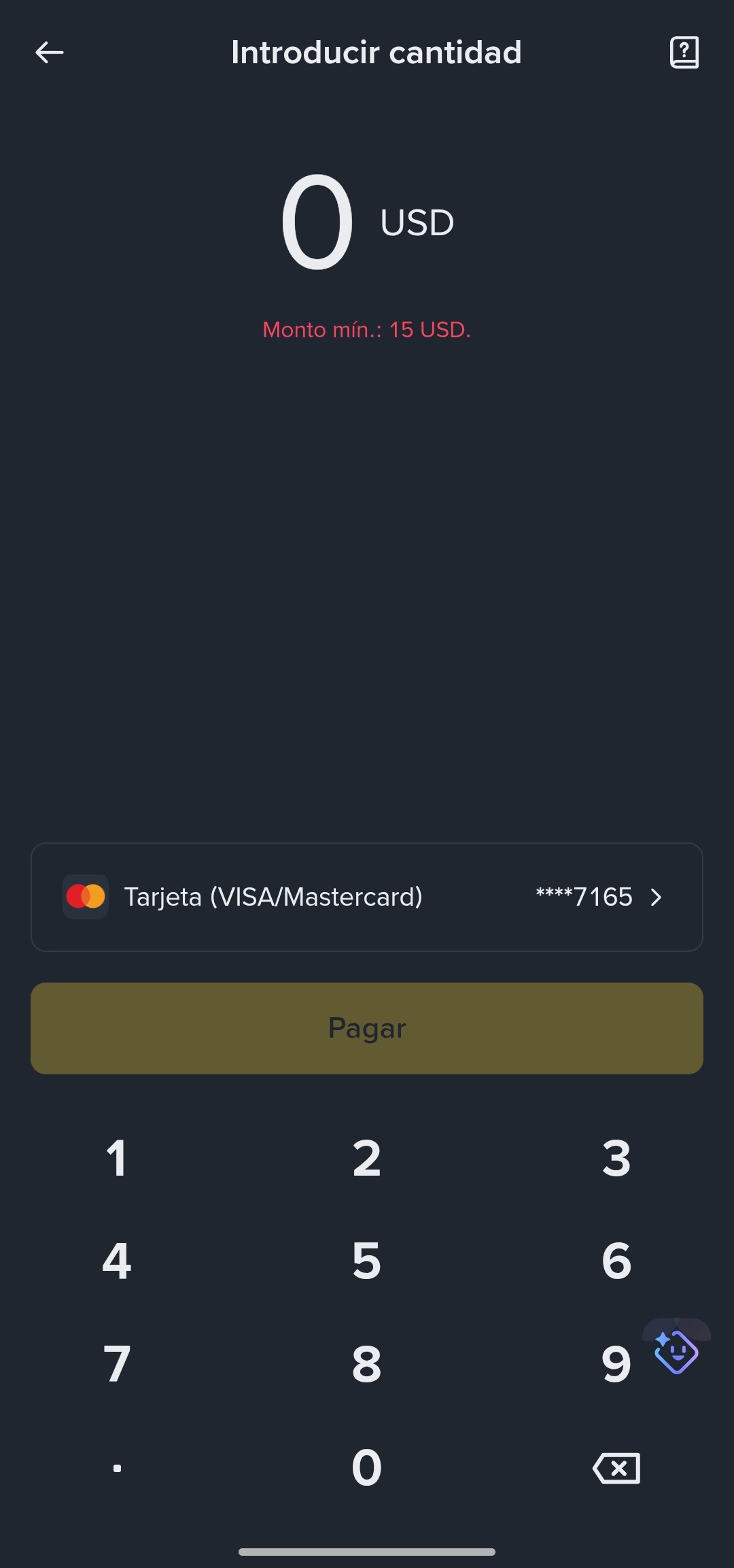 Luego se abrirá otra ventana en donde se debe colocar el monto deseado. Aquí Binance impone un monto mínimo de USD 15 como depósito usando tarjetas Visa o Mastercard vinculadas a cuentas en dólares.