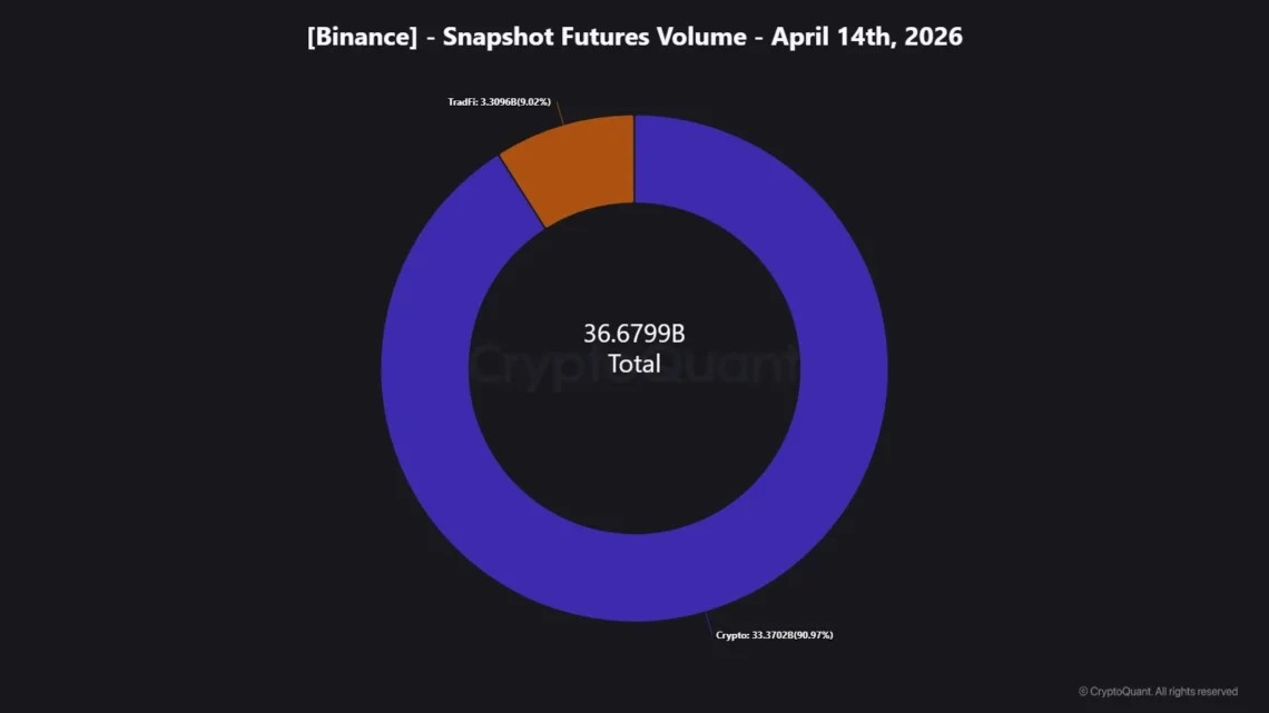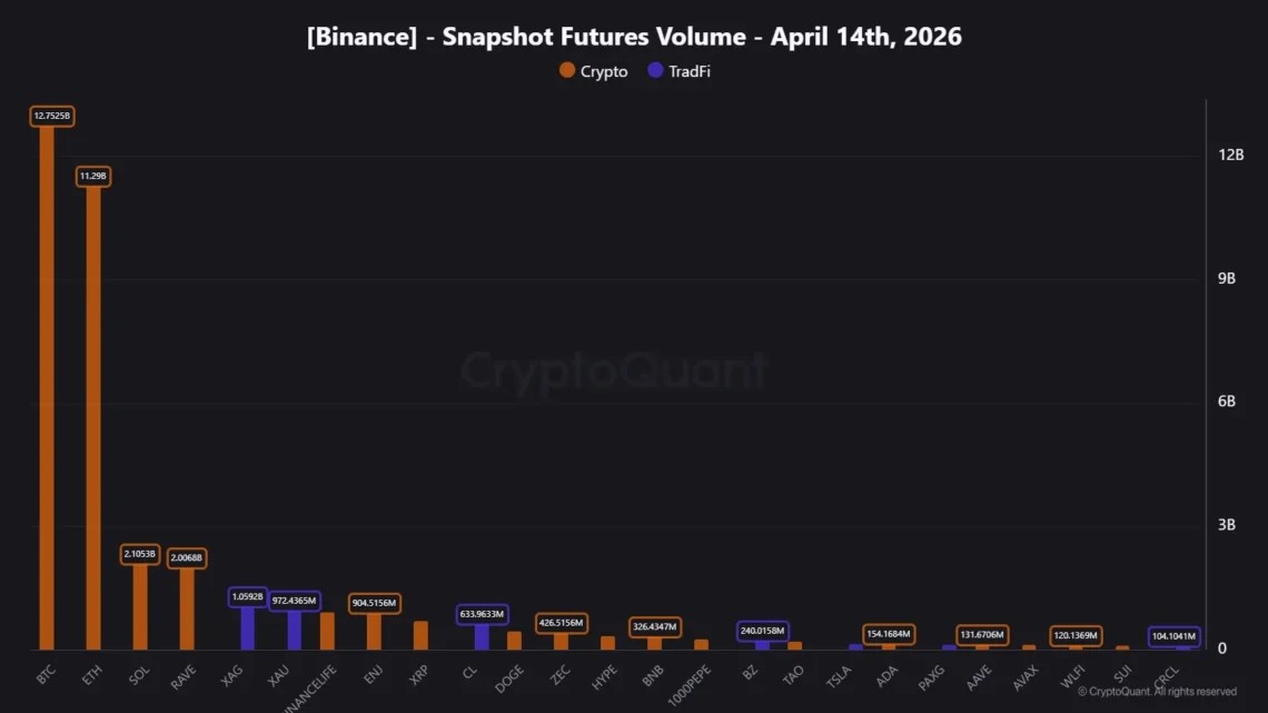 Los activos tradicionales como oro, plata, S&P 500 y petróleo, según datos del 20 de abril de 2026, representan cerca del 9% del volumen total de trading en Binance Futures, la plataforma de derivados de Binance.
