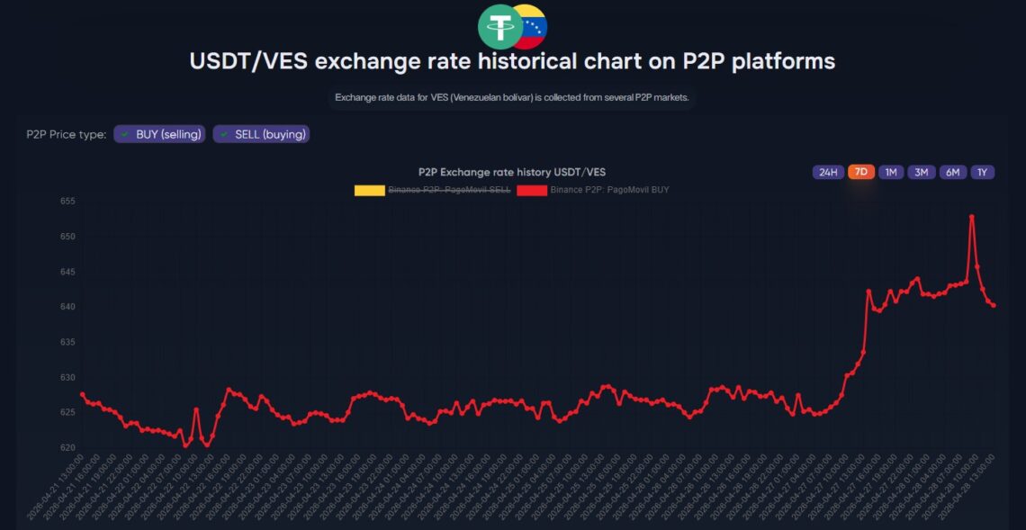 El precio de la stablecoin de Tether Limited, en moneda venezolana, alcanzó un pico máximo cercano a los 653 bolívares antes de estabilizarse ligeramente por encima de los 640 al cierre de la jornada del 28 de abril.