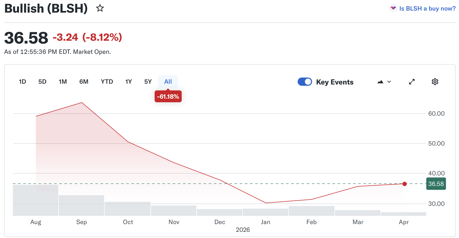 Las acciones de Bullish han disminuido drásticamente durante el último año, cayendo más del 60% desde su pico en septiembre y cotizando alrededor de 36,58 dólares en el momento de la redacción. La acción bajó aproximadamente un 8% en las primeras operaciones del día, según datos de Yahoo Finance.
