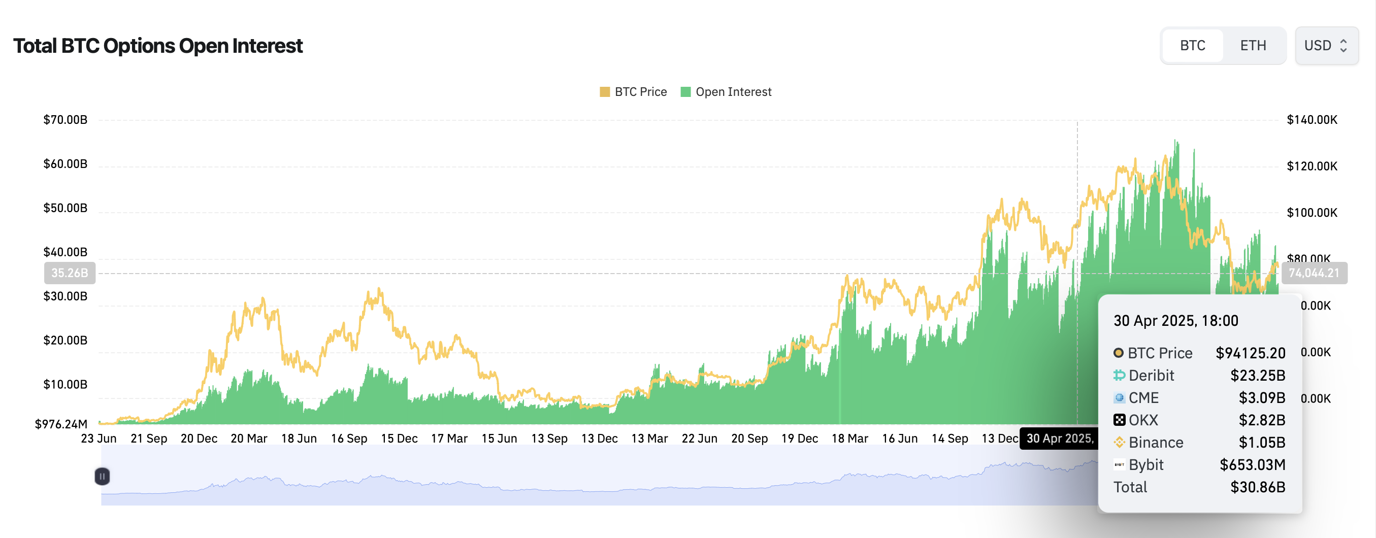 Durante el último año, los mercados de opciones de Bitcoin se han mantenido consistentemente grandes, con un interés abierto total de aproximadamente 32.800 millones de dólares a finales de abril de 2026, un ligero aumento desde los aproximadamente 30.800 millones de dólares del año anterior y alcanzando un pico superior a los 50.000 millones de dólares durante períodos de mayor actividad, según datos de CoinGlass.