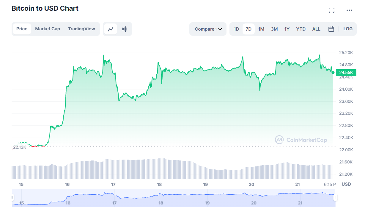 Bitcoin se ha mantenido creciente y ha ganado terreno por encima de la marca de $25,000. Después de un máximo de $ 25,126.85 hoy, cayó a $ 24,588 al momento de escribir, un 13% más en la última semana. Este subidón llevó a la criptomoneda al punto más fuerte experimentado desde el 13 de junio de 2022.