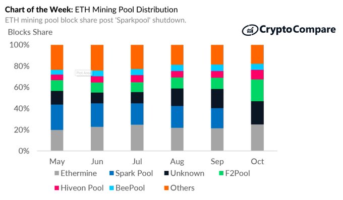 “Ethermine siguió siendo el grupo de minería ETH más grande con un 25.0% de participación, un 21.5% más que en septiembre, seguido de los mineros desconocidos (21.8%) y F2Pool (20.5%). Los 5 principales grupos conocidos ahora representan el 65.4% de los bloques ETH ".