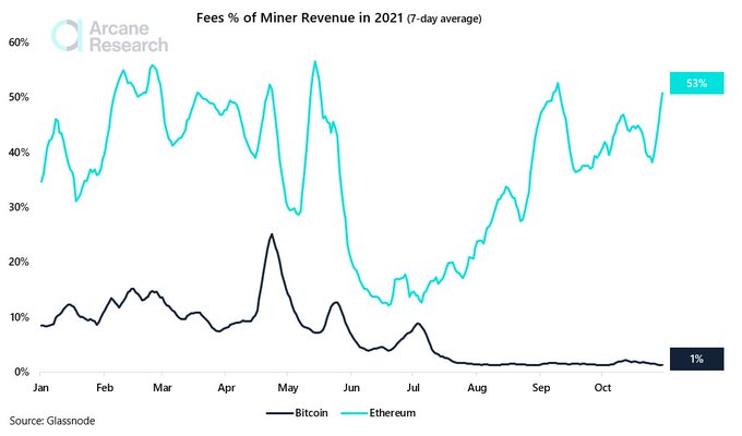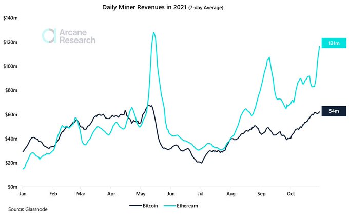 Arcane Research declaró que la principal razón por la que los mineros de Ethereum han ganado más que los mineros de Bitcoin en 2021 se basa en la actividad masiva en la red ETH, que está aumentando. tarifas de transacción.
