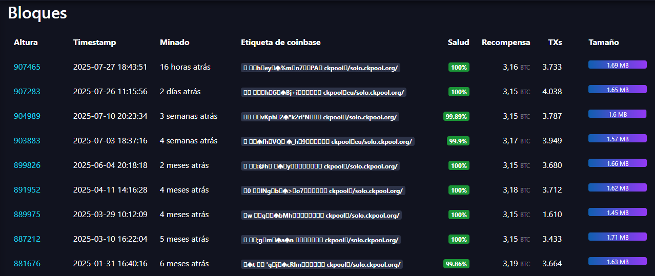 En lo que va del 2025, usuarios de Solo CKpool han dado con nueve bloques de Bitcoin, según datos de mempool.space, con cuatro de ellos registrados en julio, mientras que el primero se remonta a septiembre de 2014.