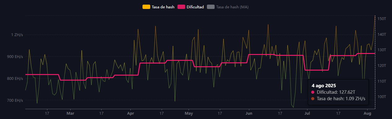La red Bitcoin registró el 4 de agosto un nuevo máximo histórico de poder computacional tras alcanzar un pico de 1,09 ZH/s (zettahashes por segundo), de acuerdo con datos del explorador mempool.space.