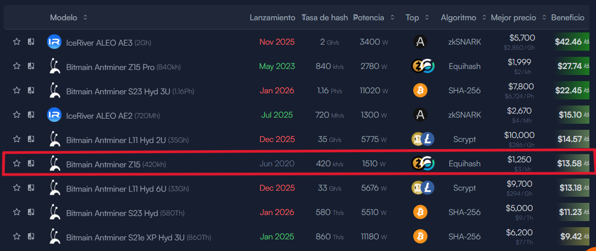 Por otro lado, el Bitmain Antminer Z15, lanzado en junio de 2020, se posicionó como el tercer ASIC más rentable del mercado. Este dispositivo, que ofrece 420 KH/s con un consumo de 1.510 vatios, produce 13,50 dólares diarios netos en promedio.