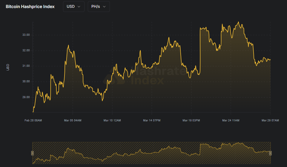 El hashprice alcanzó un máximo mensual de $33,85 por PH/s al día, pero en tres días cayó un 6,65% hasta $31,60, niveles cercanos a mínimos históricos. Los mineros obtienen unos 3,14 $BTC por bloque, mientras que las comisiones en cadena representan apenas el 0,43% de la recompensa, con un costo medio de $0,27 por transacción.