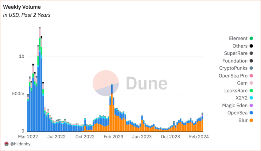 Sin embargo, queda por ver si este resurgimiento puede volver a las alturas de la racha alcista de 2021-22, en la que los volúmenes negociados se dispararon. En el momento de escribir estas líneas, el volumen de trading de NFT sigue estando un 75% por debajo de su máximo.