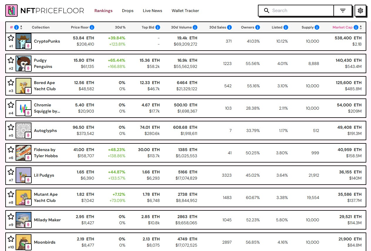 CryptoPunks mantiene su liderazgo con 69,2 millones de dólares en volumen negociado en 30 días, seguidos de cerca por Pudgy Penguins, con 55,5 millones.