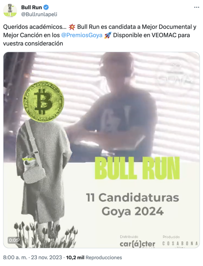 Después de haber sido seleccionada para participar en el prestigioso festival de cine documental DOC NYC, la película documental sobre Bitcoin‘Bull Run‘ trae más buenas noticias. La cinta fue nominada a los Premios Goya 2024 por Mejor Largometraje Documental. La organización de la cinta dio a conocer la noticia a través de su perfil de X.