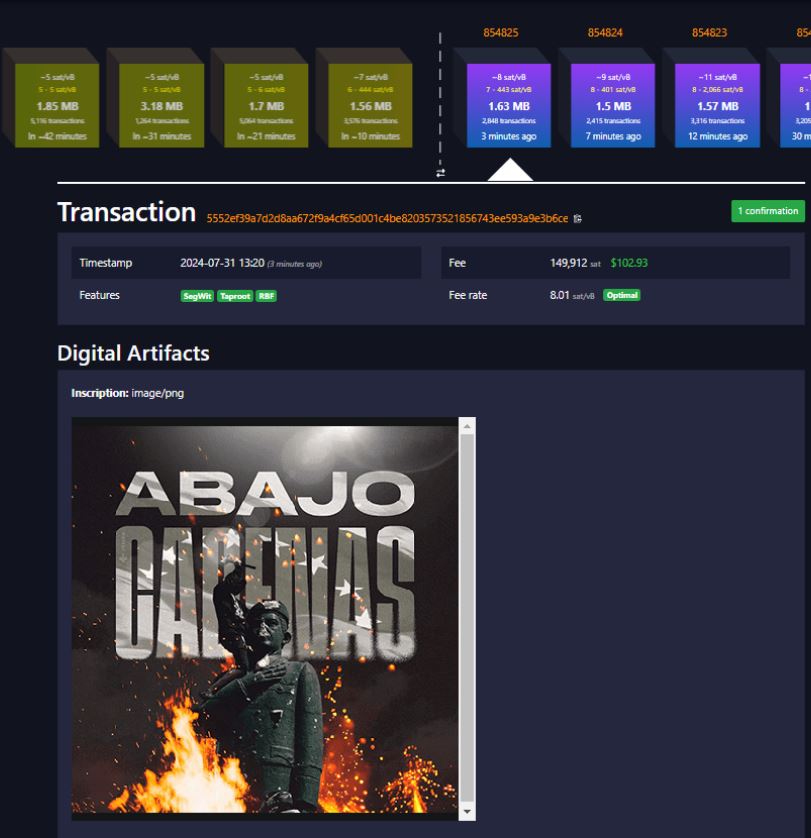 De acuerdo con los datos en cadena, el Ordinal pesa 73.868 KB, es un archivo PNG y se inscribió a la altura del bloque 854.825. Por su inscripción, se pagó una tarifa de 149.912 sats, equivalentes a unos USD 100, aproximadamente.