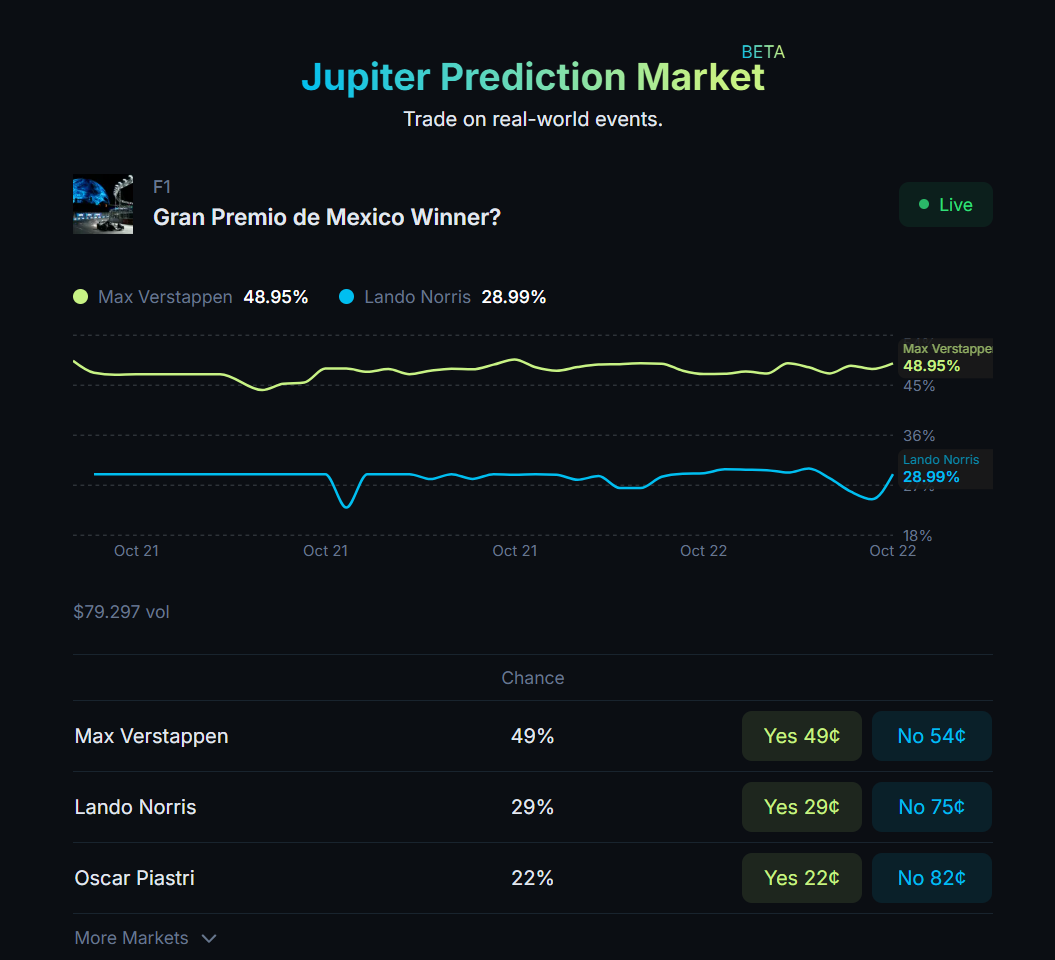 El exchange descentralizado (DEX) Jupiter anunció el lanzamiento de su primer mercado de predicciones con apuestas en criptomonedas, disponible desde hoy en versión beta con una convocatoria que atrae a los fanáticos de la Fórmula 1 (F1).