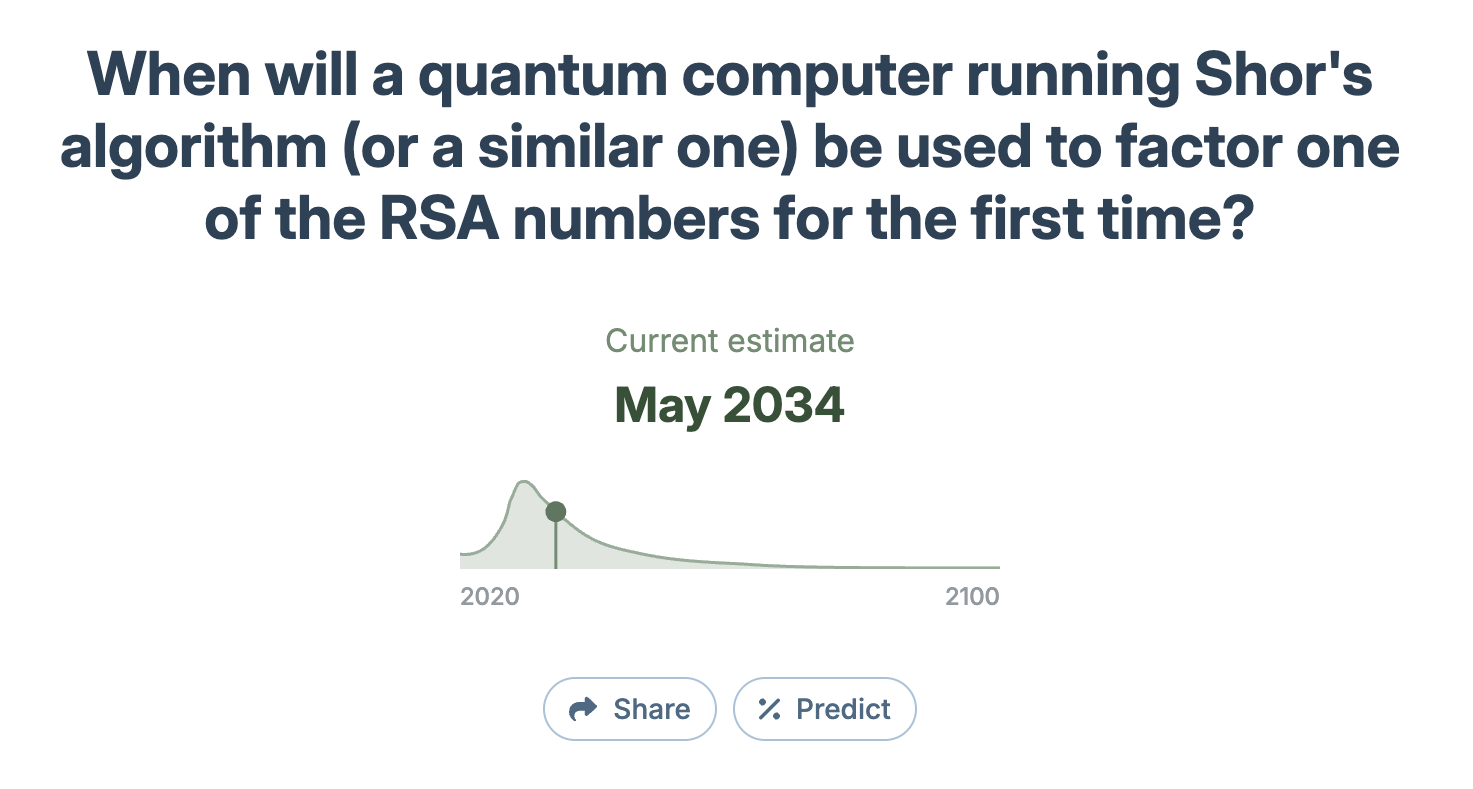 Antes de lo previsto, Metaculus ahora predice que las computadoras cuánticas podrían factorizar un número RSA utilizando el algoritmo de Shor para 2034. Esto es casi 20 años antes que la predicción previa de 2052.