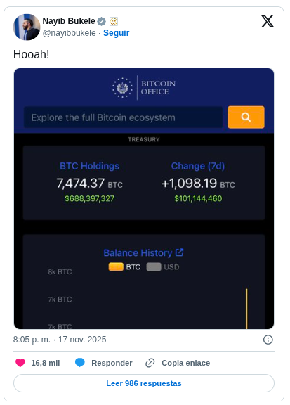 La estrategia Bitcoin del Gobierno de El Salvador volvió a ser noticia tras la compra de 1089 BTC en un momento en que el precio de la criptomoneda cayó por debajo de los 90,000 dólares. El movimiento elevó las reservas nacionales a más de 7,474 BTC, destacando la continuidad de la estrategia gubernamental en torno al activo digital.