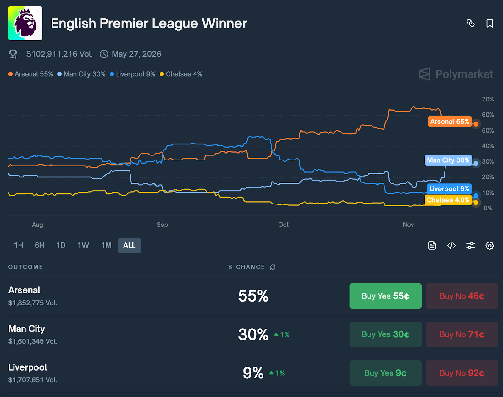 Una forma concreta de observar la conexión entre fan tokens y las dinámicas de predicción es observar el mercado de “Ganador de la Premier League Inglesa” en Polymarket, que se resuelve en mayo de 2026. Antes de octubre de 2025, Manchester City estaba ligeramente favorecido sobre Arsenal. Sin embargo, a medida que Arsenal comenzó su racha ganadora, el mercado rápidamente revaloró las expectativas: la probabilidad implícita de Arsenal aumentó de aproximadamente 35% a 55%, mientras que Manchester City cayó de alrededor de 45% a 30%.
